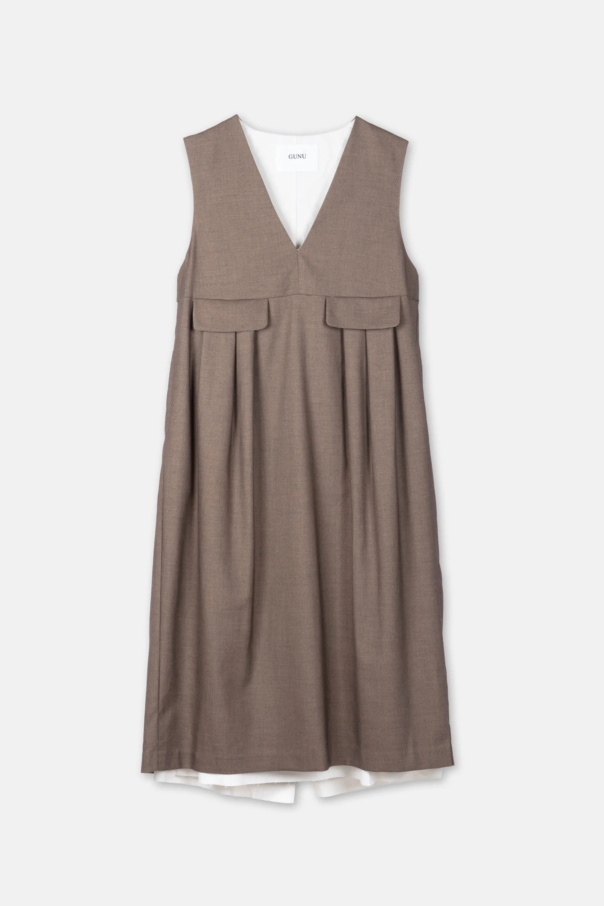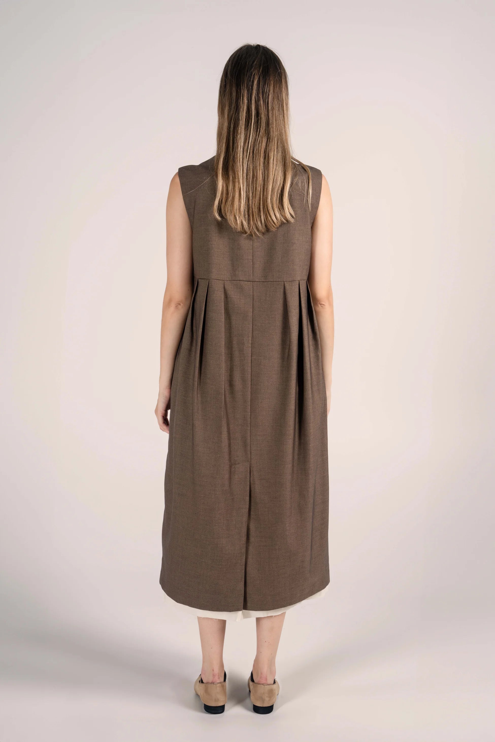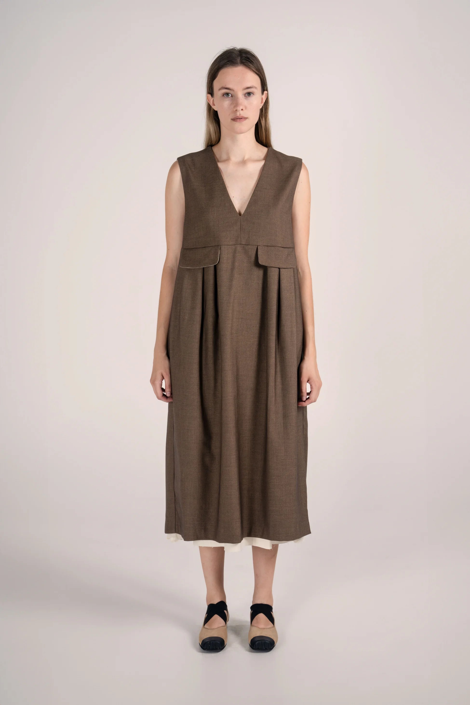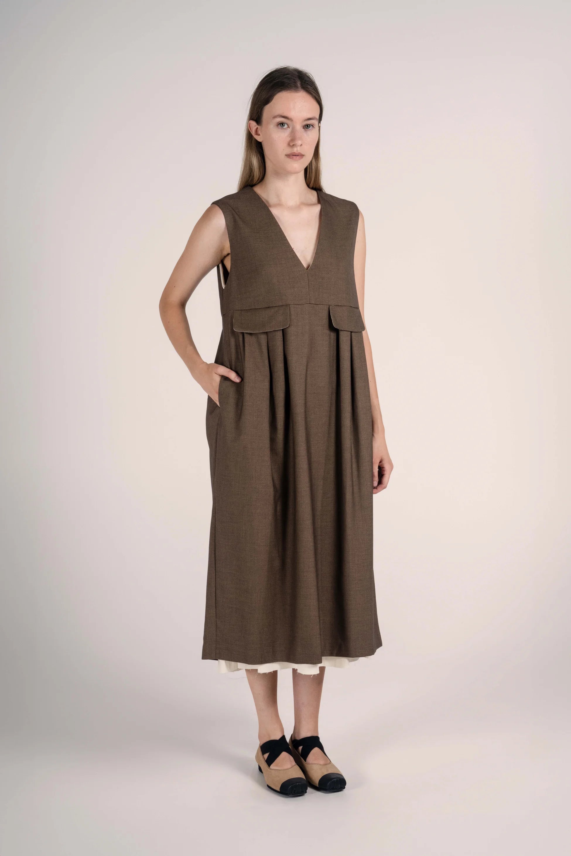 V Yaka Pileli ve Cep Detaylı Kolsuz Midi Pamuklu Elbise - Kahverengi